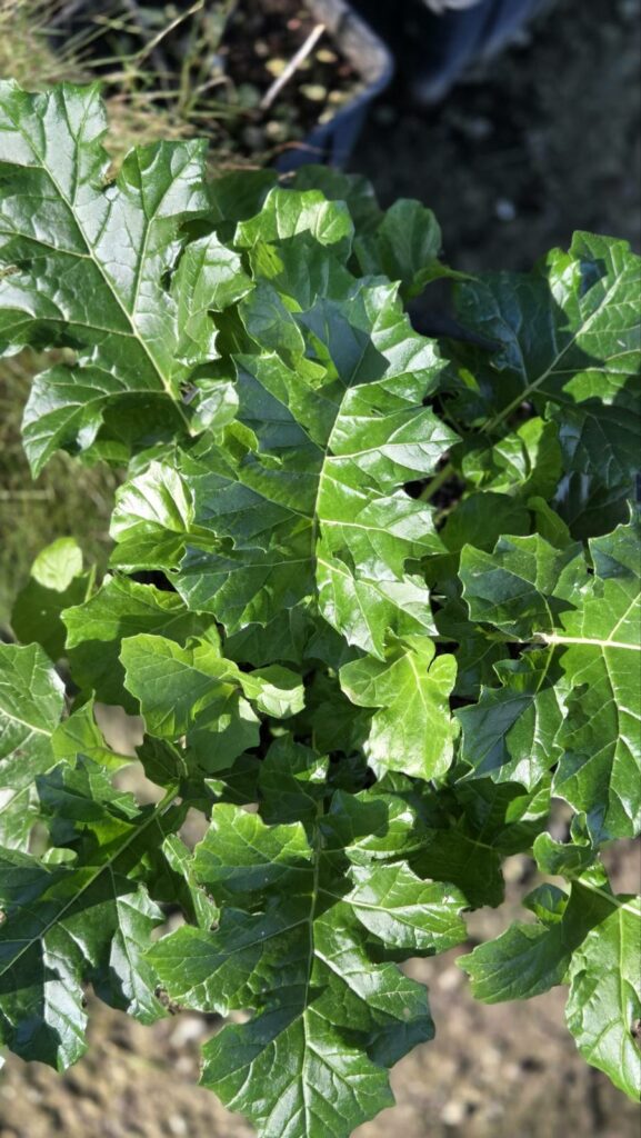 Αποτελείται από μεγάλα, γυαλιστερά, βαθιά σχισμένα φύλλα με έντονο πράσινο χρώμα. Τα φύλλα του μπορεί να φτάσουν σε μήκος τα 80-100 εκ.
